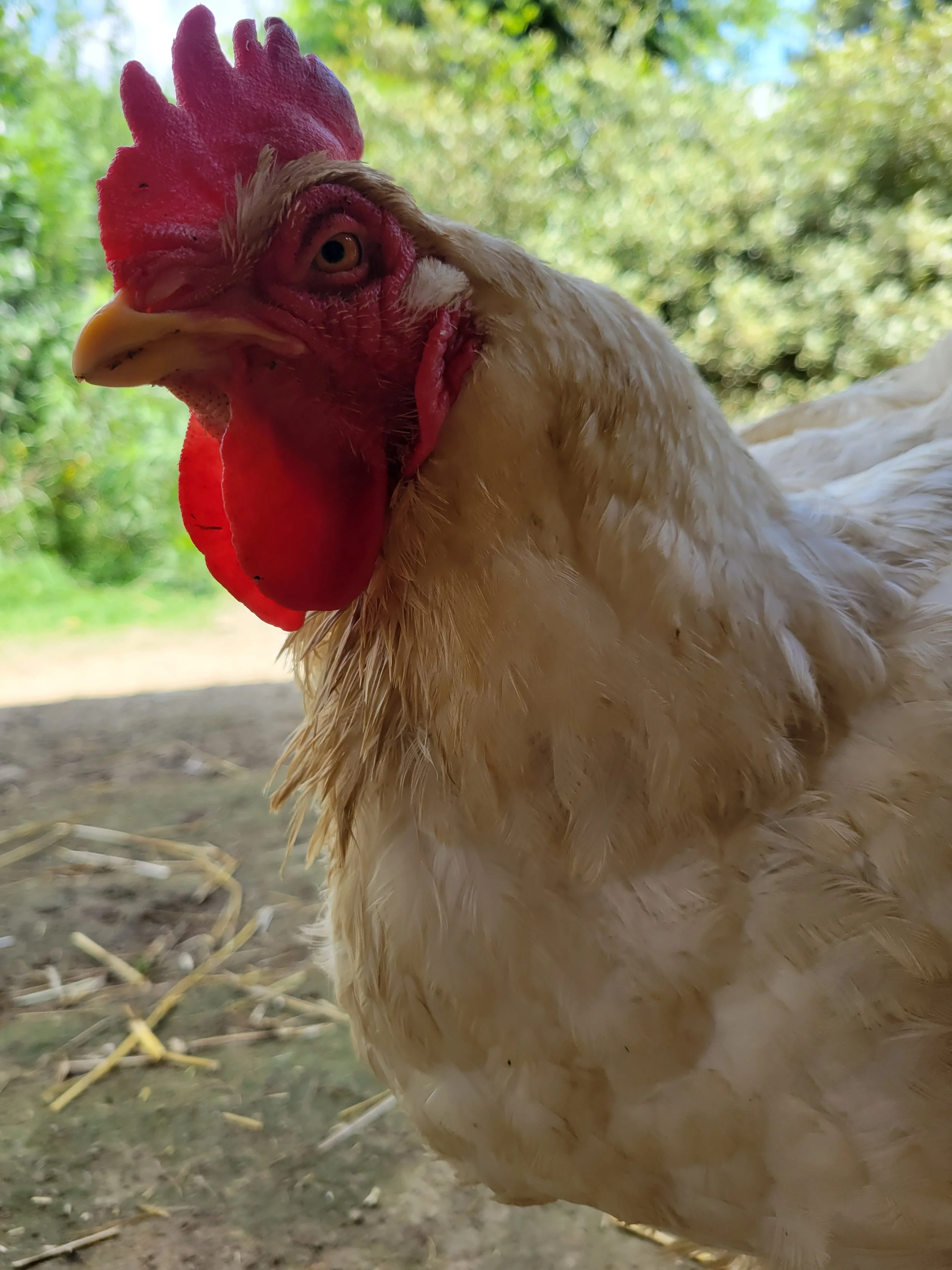 Adrienne was sadly living in a factory farm in Georgia. She was being used as a breeder bird for cornish cross chickens who are used in the industrial meat industry. When a tornado struck the factory, thousands of individual chickens were left alive but slated to be bulldozed with the rest of the remaining rubble. Luckily rescuers were allowed on site and saved hundreds of surviving hens. When Adrienne arrived at the Refuge she was filthy and suffering from severe bumblefoot, a condition commonly seen in these birds due to their large size and unsanitary living conditions. When she was finally healed and released into our chicken house, she experienced the outdoors - the grass, the dirt, the sun - for the first time in her life. She now enjoys many adventures in the woods and pastures with her flockmates.