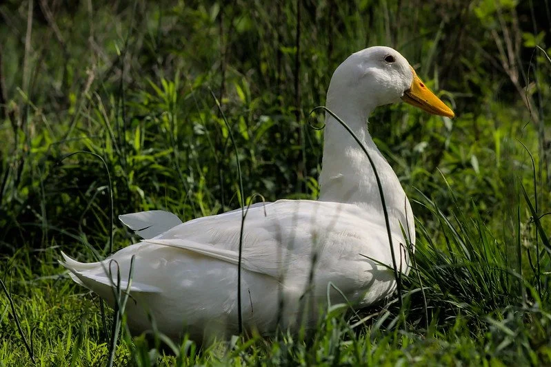 Rocky and Pebbles were rescued by a kind woman in Virginia after they had been abandoned in a stormwater drainage area. During a heavy rainstorm, the woman saw that a large white duck was struggling to stay on top of a rock while water quickly rushed all around him. Luckily, she was able to grab him, but when she went back the next day, she saw that another smaller duck had also been left behind. After getting them both to safety, she contacted the Refuge about providing a forever home.